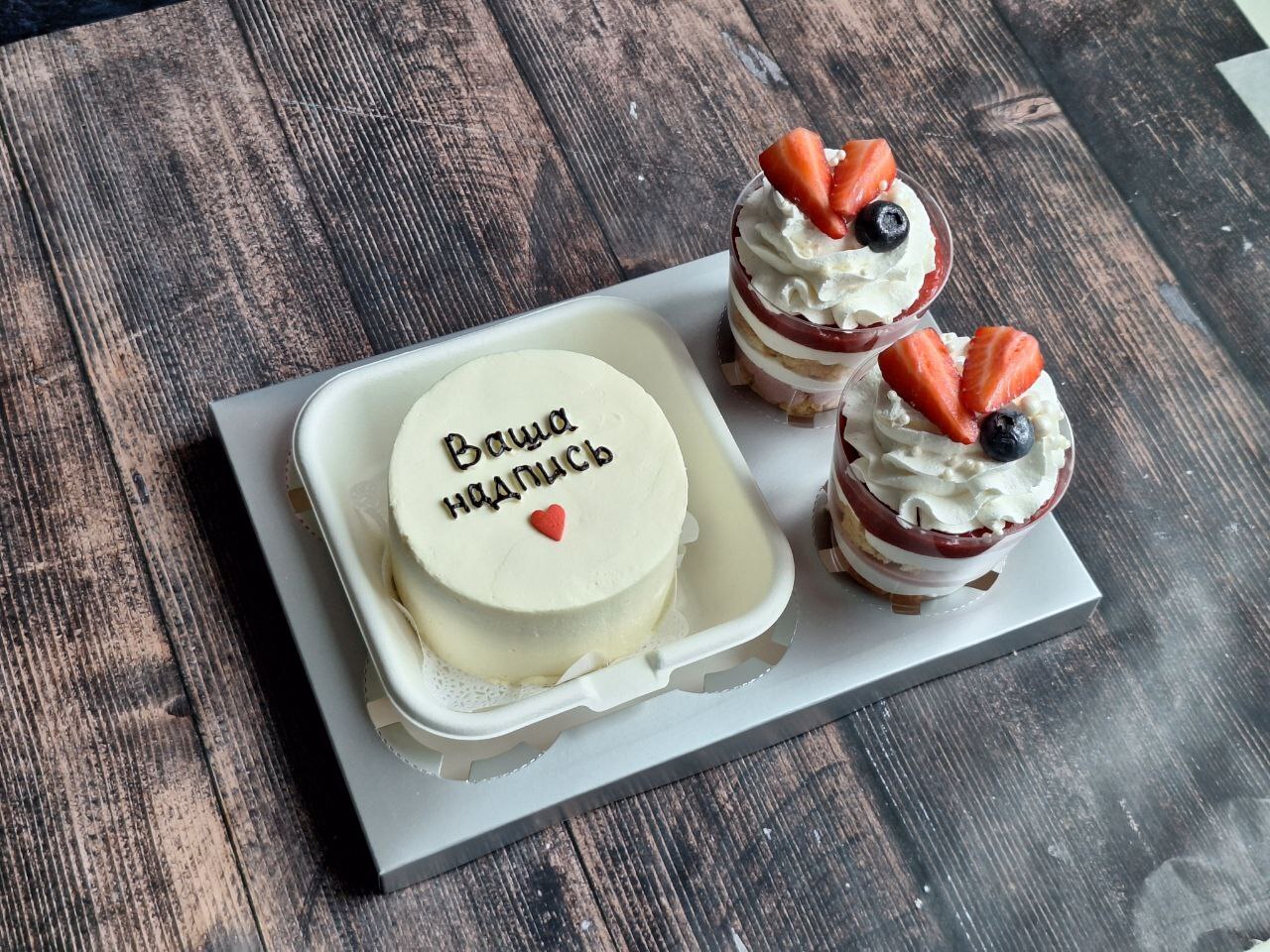 Комбо-набор Бенто-торт с вашей надписью и 2 десерта трайфла в стакане, 850 гр.
